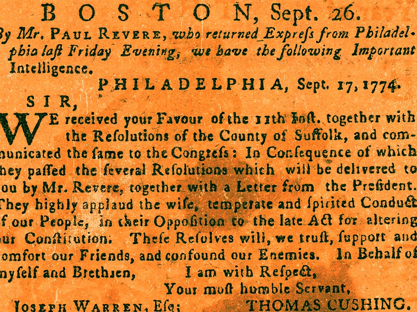 The Suffolk Resolves were important for their content and effect, which I’ll turn to in a moment. Upon their approval, their lead author, Dr. Joseph Warren, directed his friend Paul Revere to carry them in haste to Philadelphia. Revere delivered the Suffolk Resolves to the new Continental Congress on September 16—the first paper that the new Congress reviewed. On September 17, Congress had the Resolves read aloud, voted to approve each paragraph, and then—despite the close secrecy of the rest of the Congress’s deliberations—voted to publish the Suffolk Resolves in newspapers around the colonies. All these votes were unanimous, which was quite a feat for a body that included delegations as different as those from Massachusetts and South Carolina.